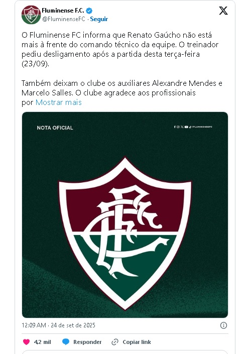 Depois do jogo, Renato marcou presença normalmente na coletiva, mas surpreendeu na última resposta ao anunciar sua saída, ironizando o que classificou como “gênios da internet” e lamentando a atual fase do futebol brasileiro diante das redes sociais.